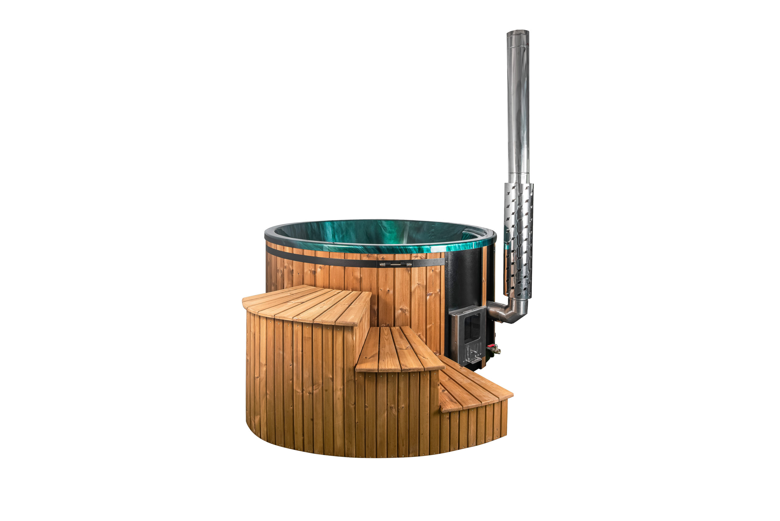Piec zewnętrzny jest umieszczony poza balią, zwiększa ilość miejsca w środku, idealny dla większych grup użytkowników.